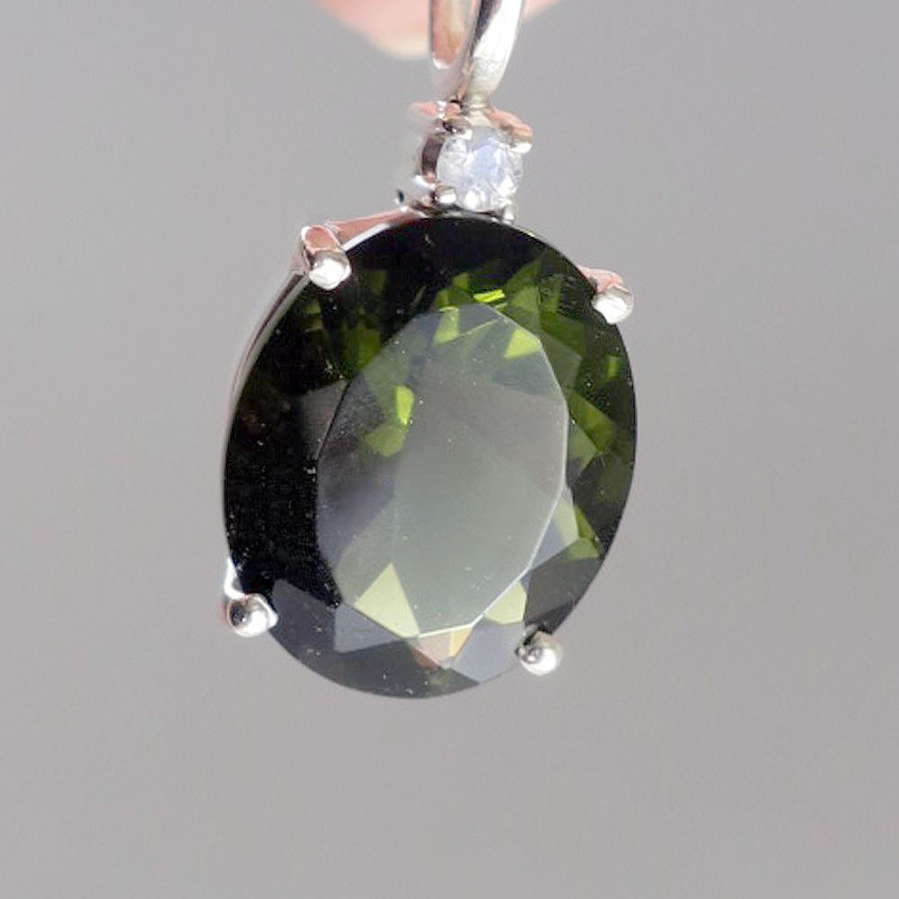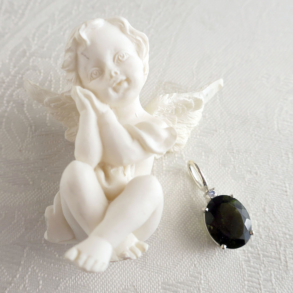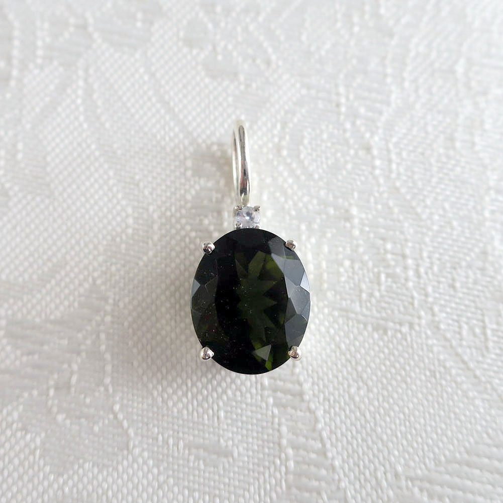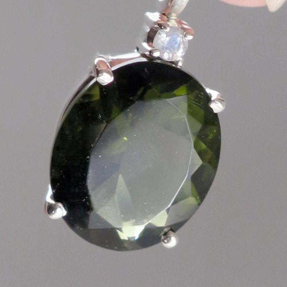 モルダバイトのカットルースとムーンストーンを用いたバチカン一体型のエレガントなペンダントです。