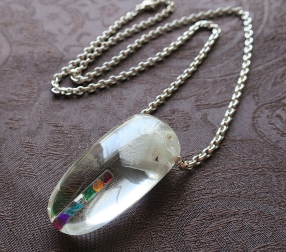 透明度の高いファントムポイントを磨いて、アロマと共に、チャクラカラーのガーネット、エメラルド、パライバトルマリンのさざれ石を閉じ込めた、唯一無二のアーティスティックなスピリチュアル・ネックレスです。