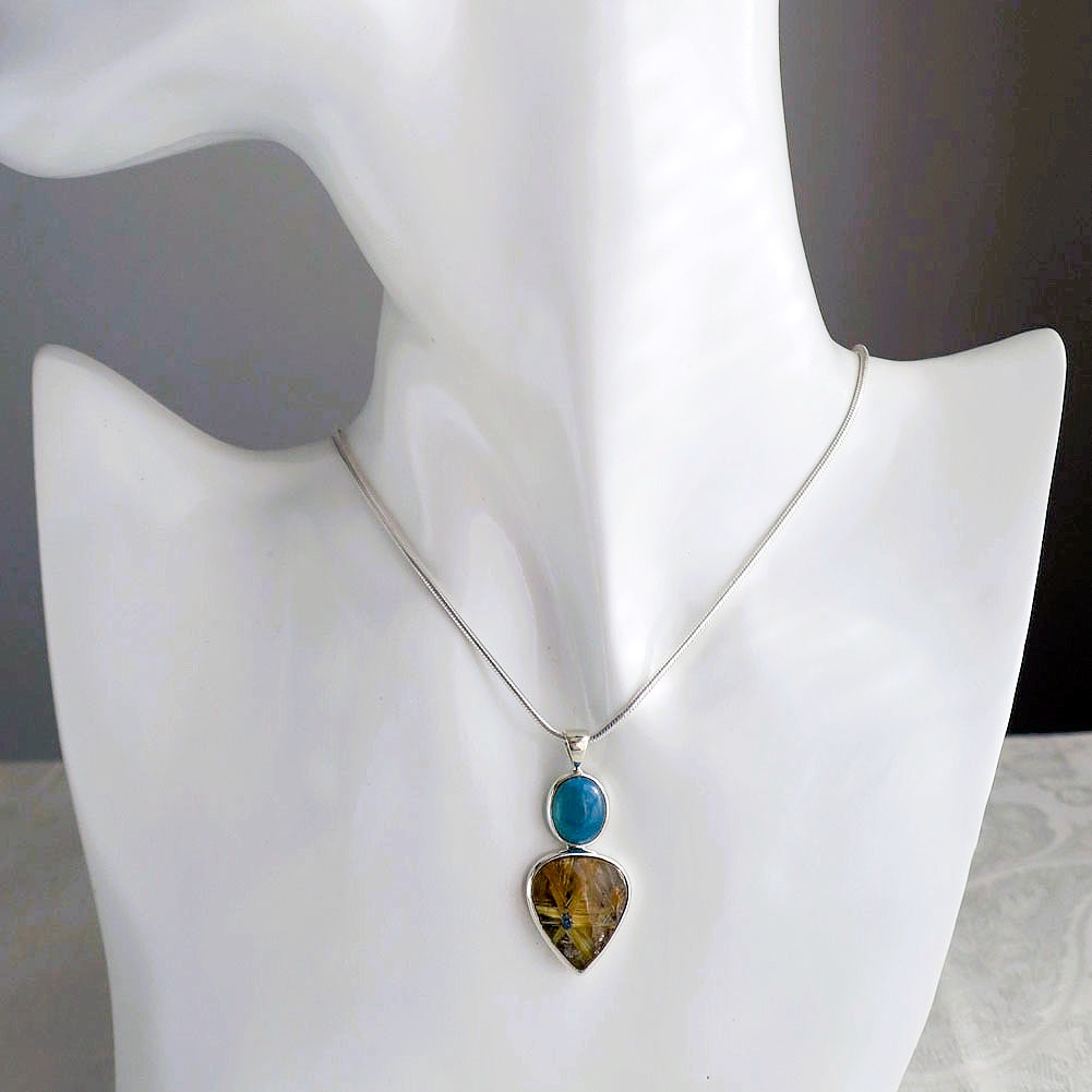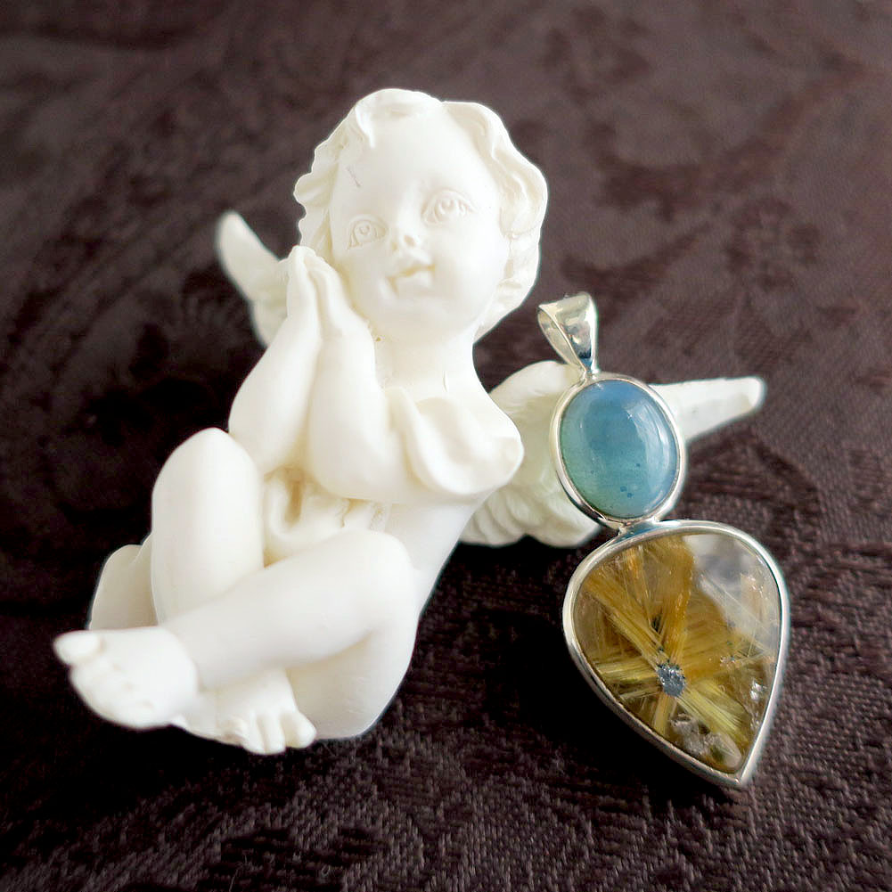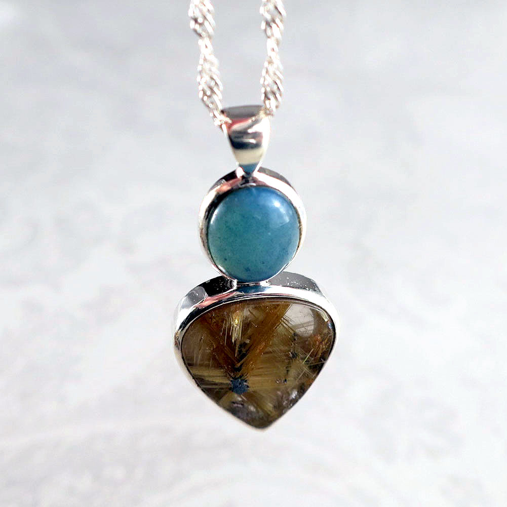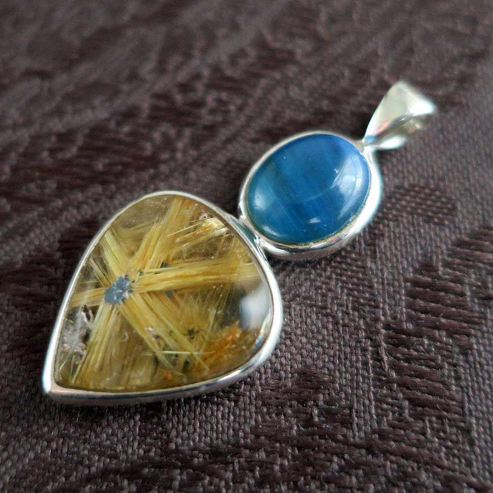 まるで太陽の様にゴージャスな、太陽(タイチン)ルチルとスウェディッシュブルーのユニークなコンビペンダント。