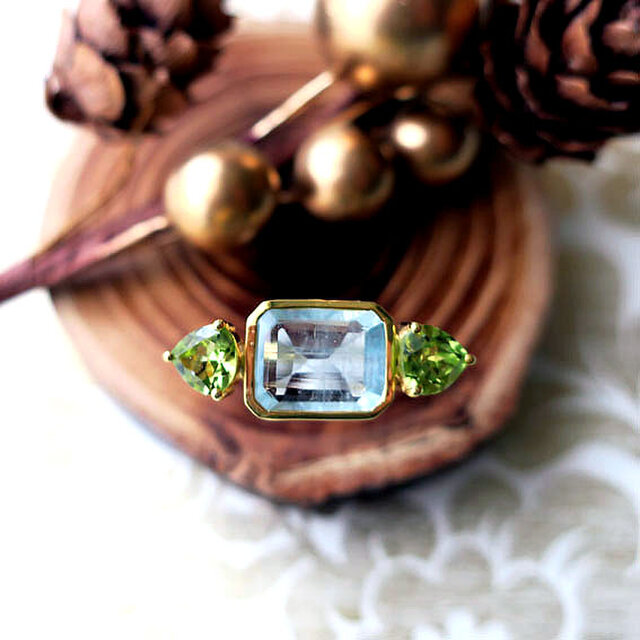 エメラルドカットの施された質の高いアクアマリンに、ペリドットを2つ添えたゴージャスなリング。クラシカルなデザインで、パーティやフォーマルな会合、お出かけのお洒落にもおすすめの天然石ジュエリーです。シルバー925に厚めのK18ゴールドコーティングが施してあります。
