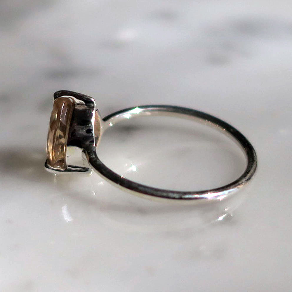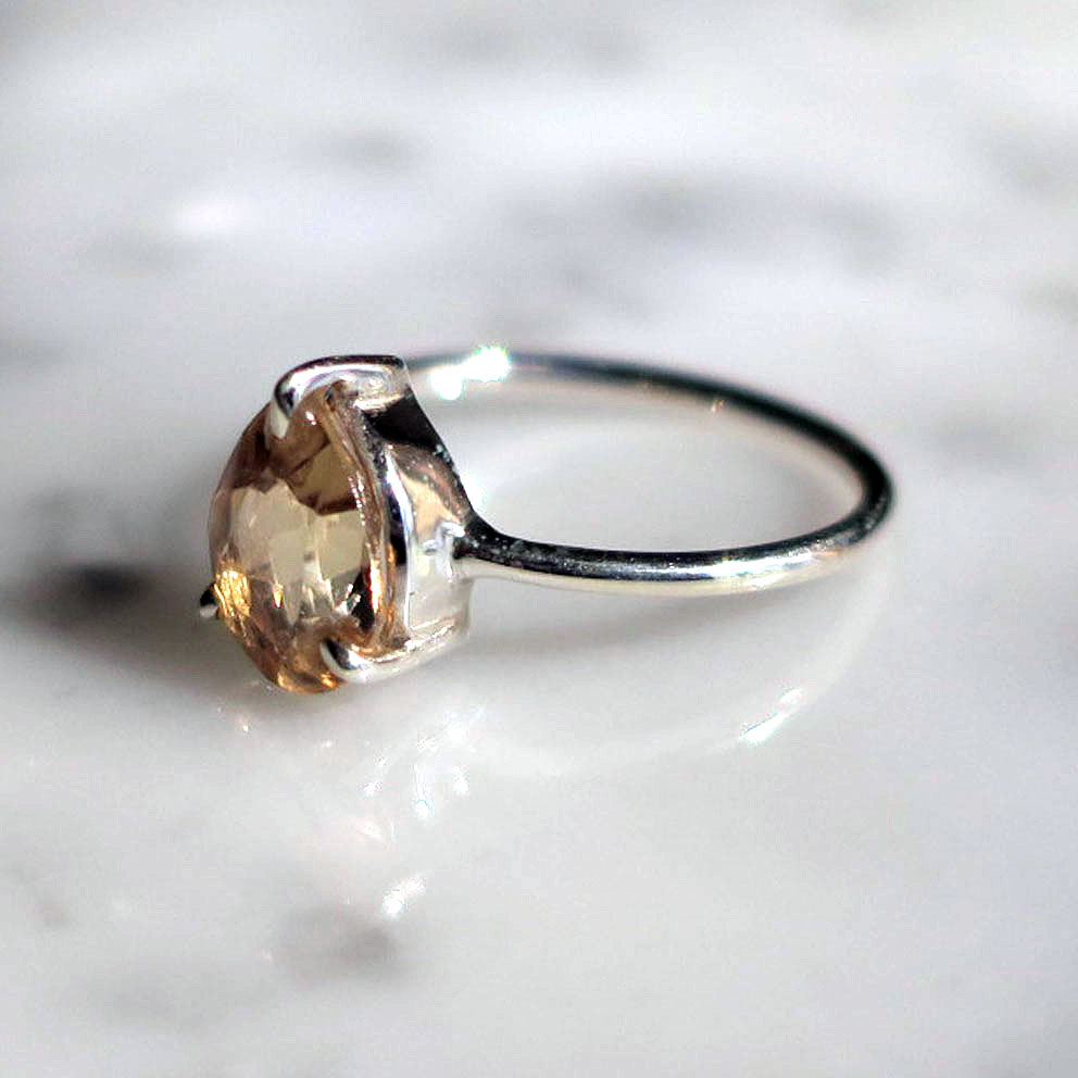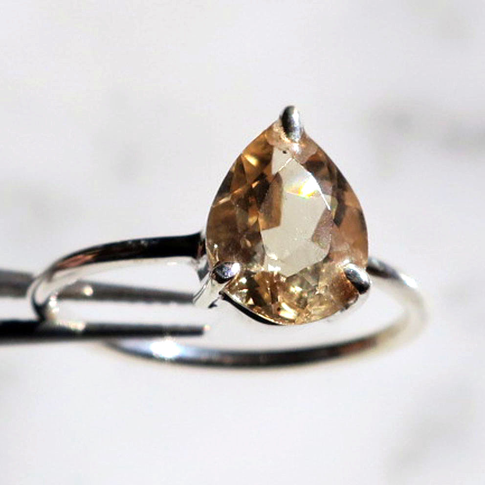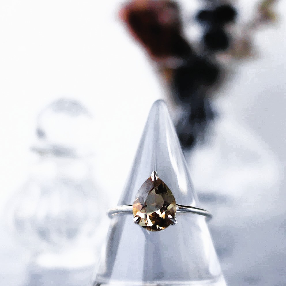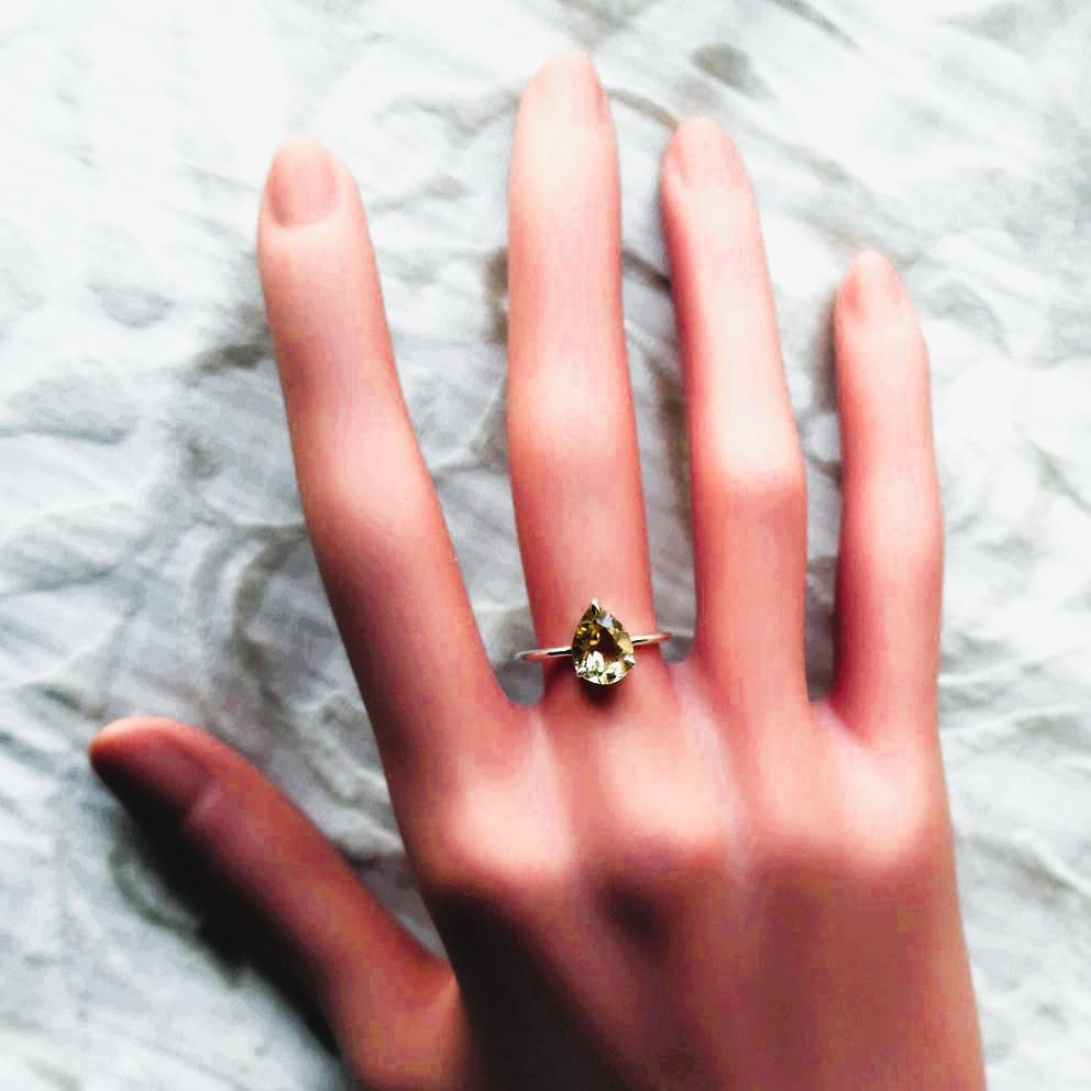 透明感のあるしずく型ゴールデンスキャポライトのファセットカットルースをひと粒用いた、シンプルなシルバーリング。