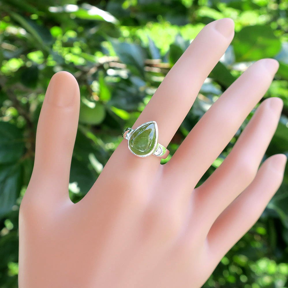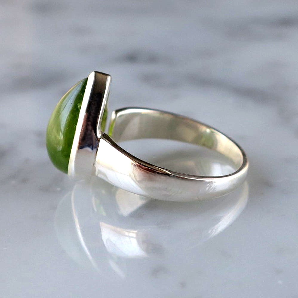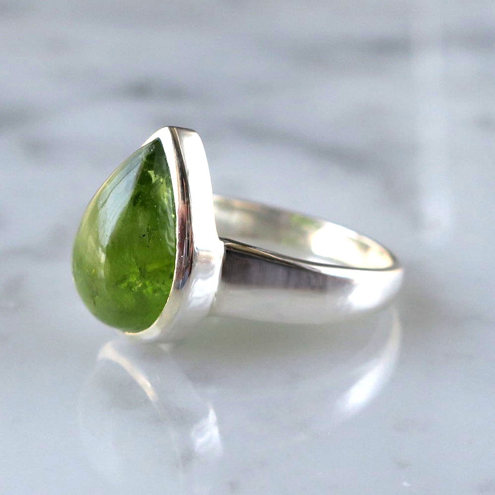透き通るような爽やかグリーンが美しいペリドットのしずくカボションリング。