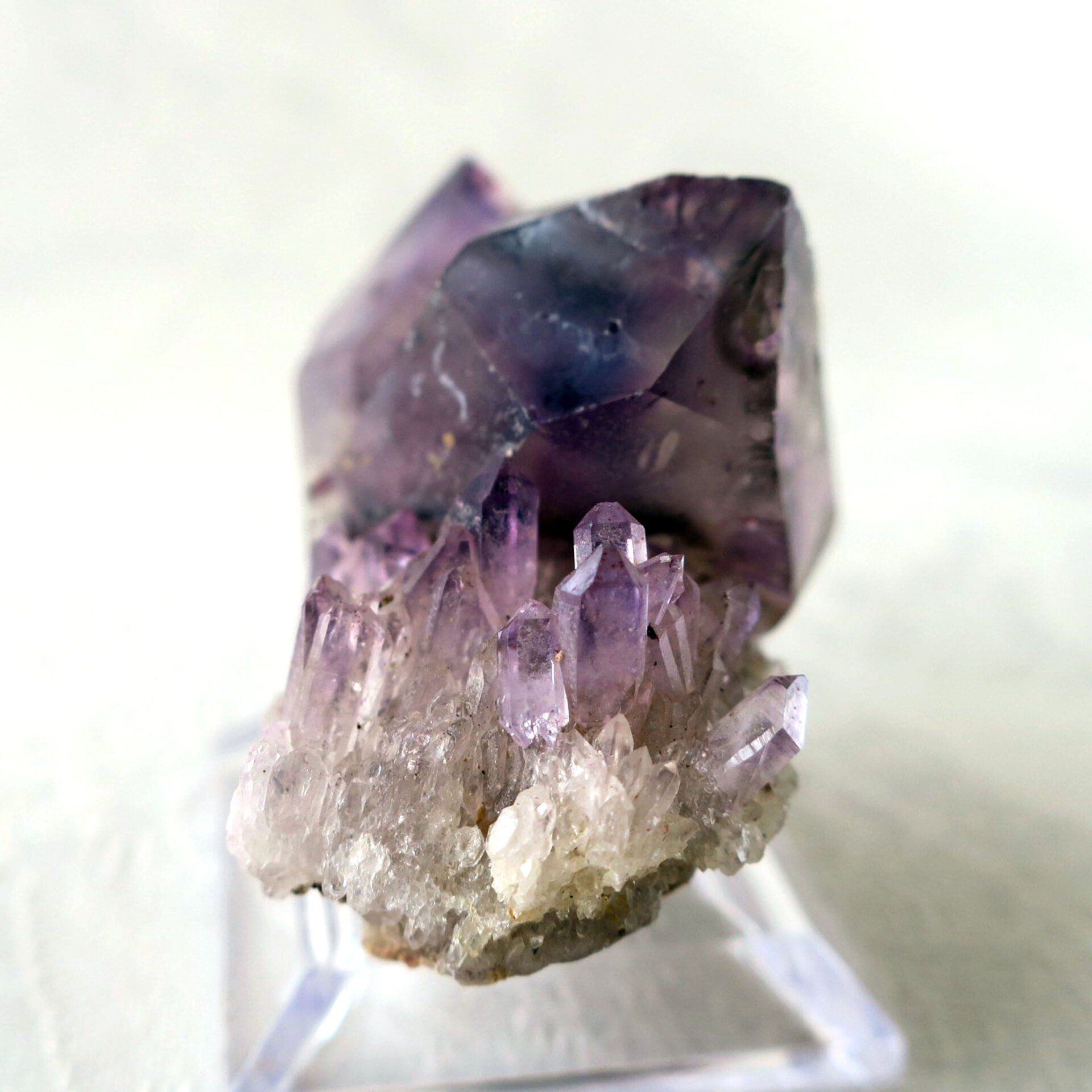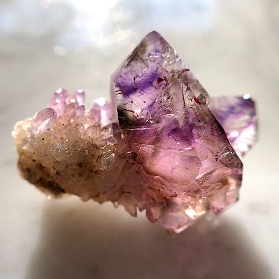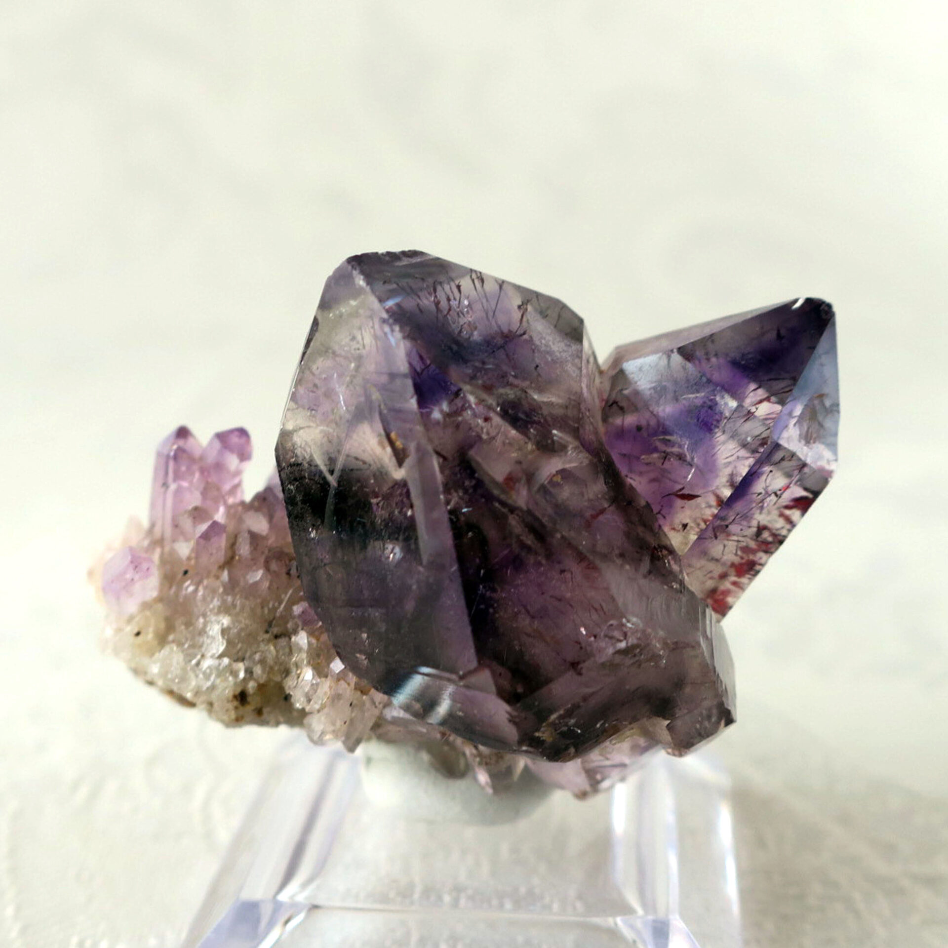 ナミビア産ブランドバーグアメジストと呼ばれる美しいアメジストの完全結晶・原石クラスター。レピドクロサイト・ゲーサイトの内包された透明度の高いエレスチャル型のスーパーセブン・ツイン結晶が、アメジストクラスターの上に鎮座した、美しいアートピースです。