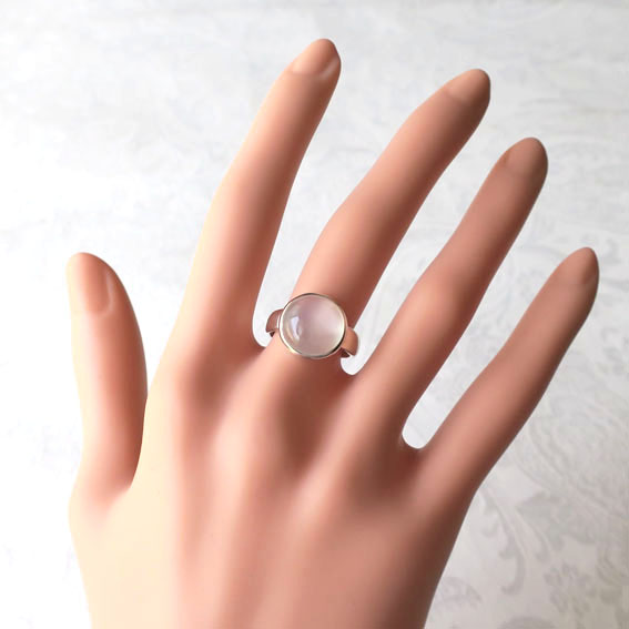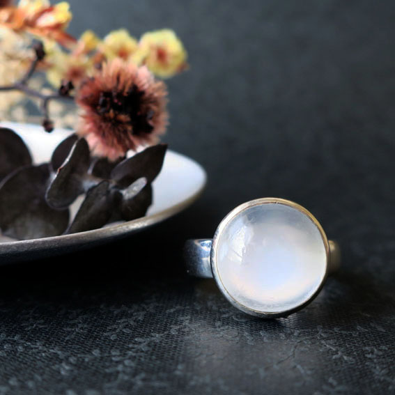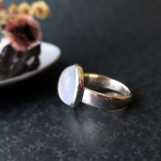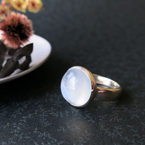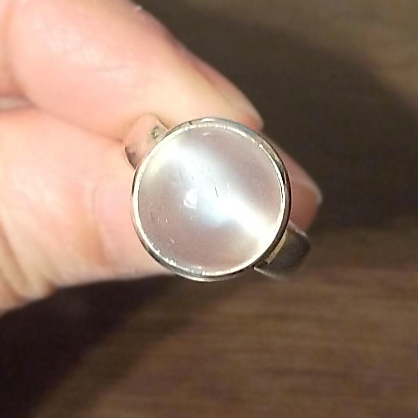 ミルキーボディに、猫の目みたいなくっきりとしたキャッツアイを伴う、満月の様なムーンストーンのまんまるリングです。