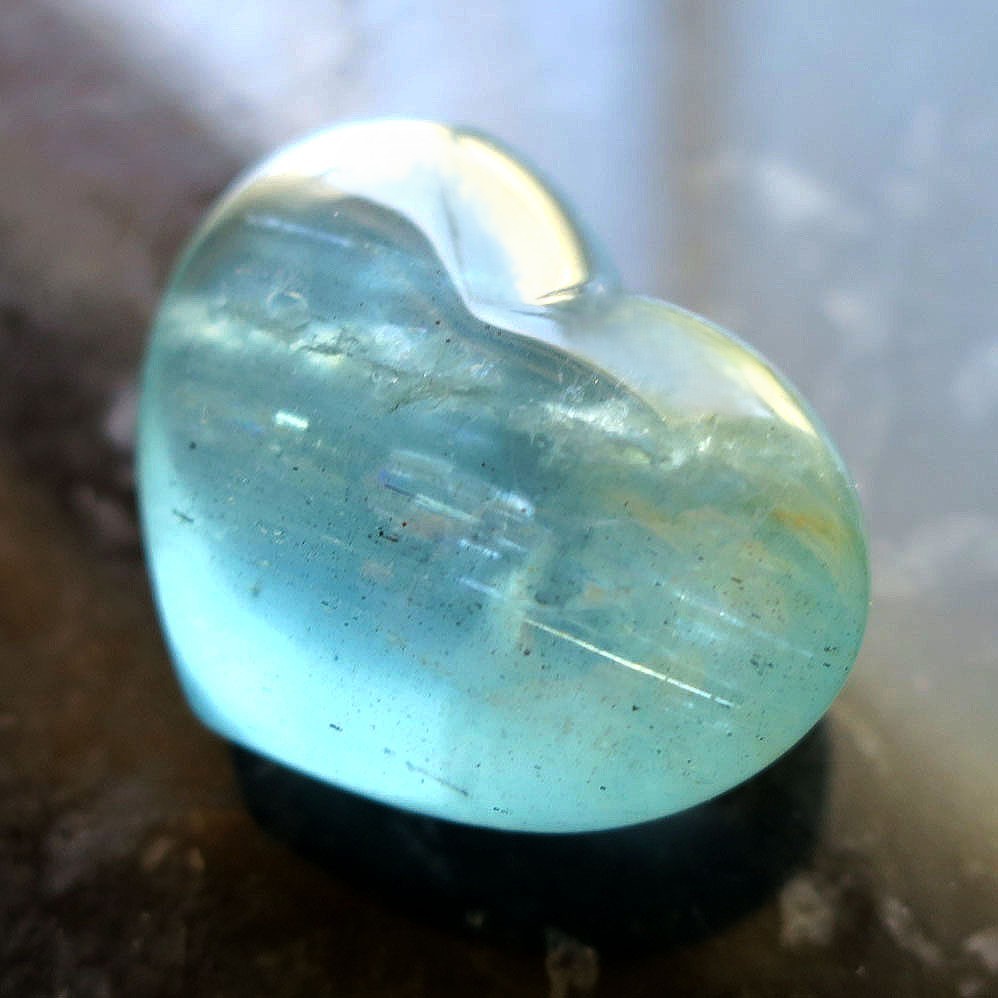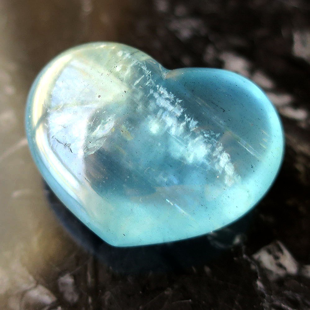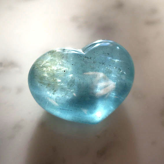お色の濃く透明感の高い、大きめのブルートパーズに、カービング技術の最高峰として有名な、イーダーオーバーシュタインカットが施された、かわいいぷっくりハートシェイプ・カービングです。