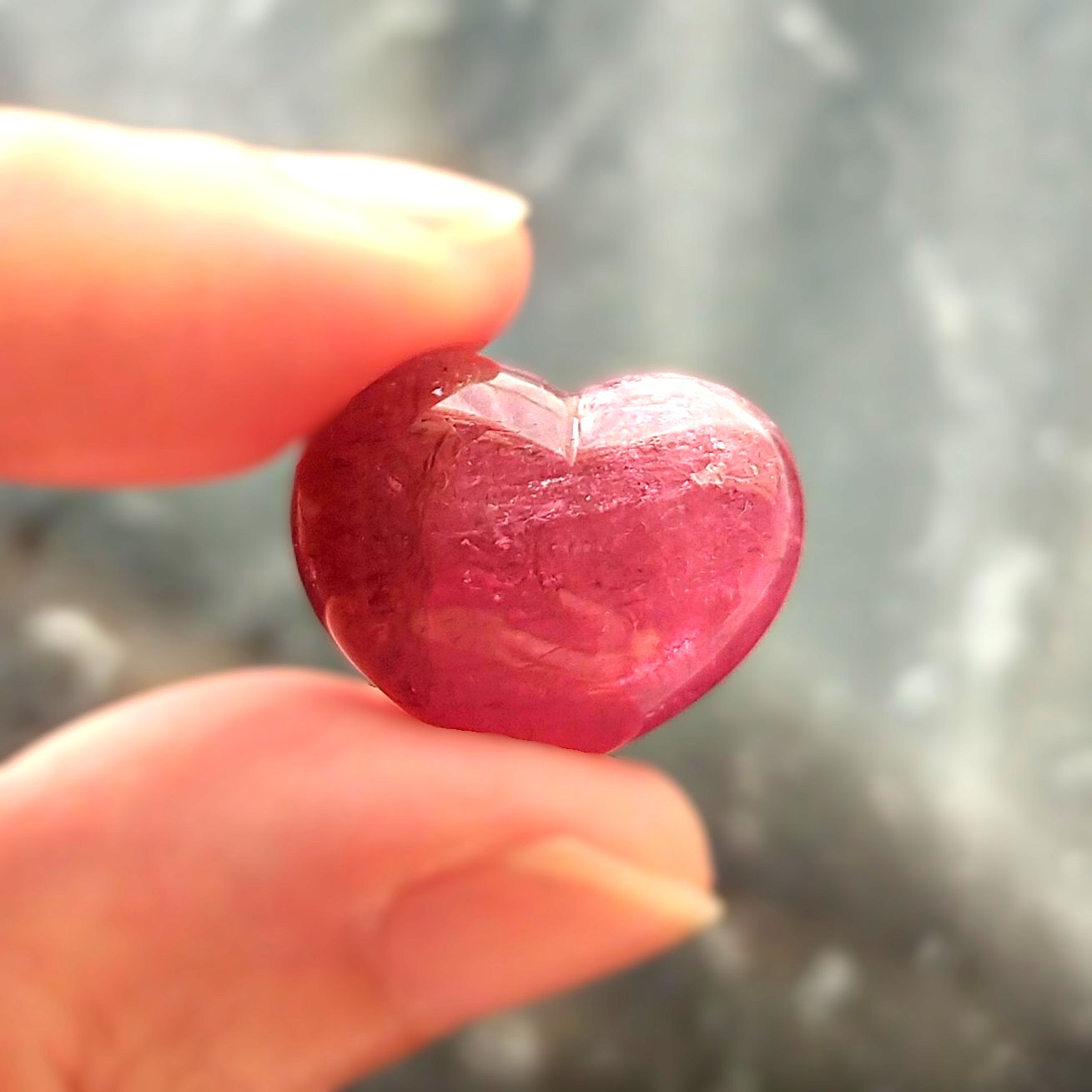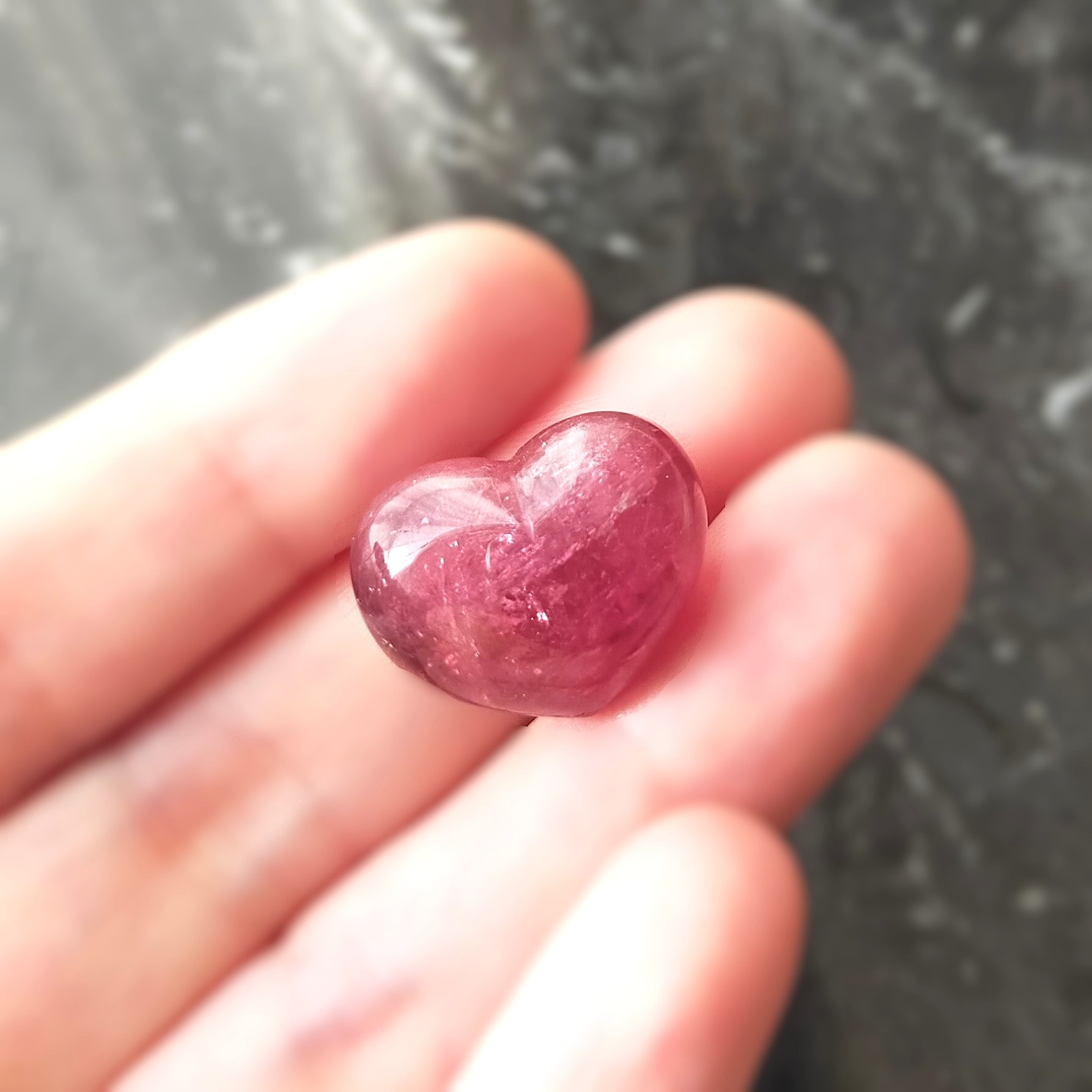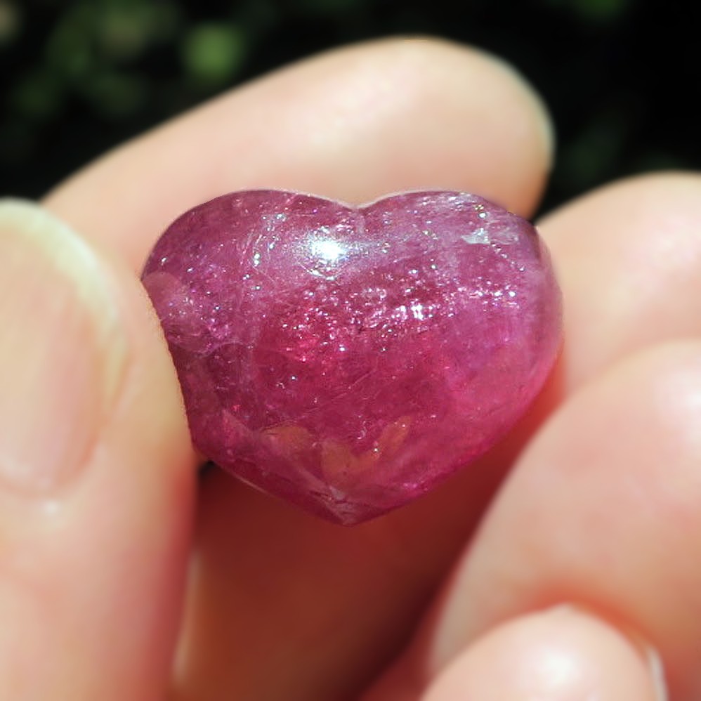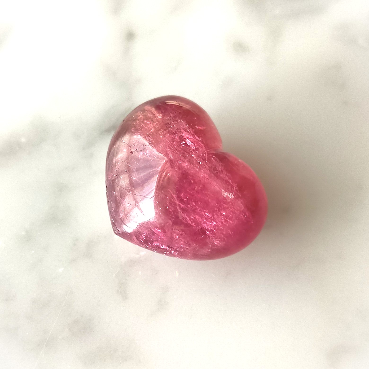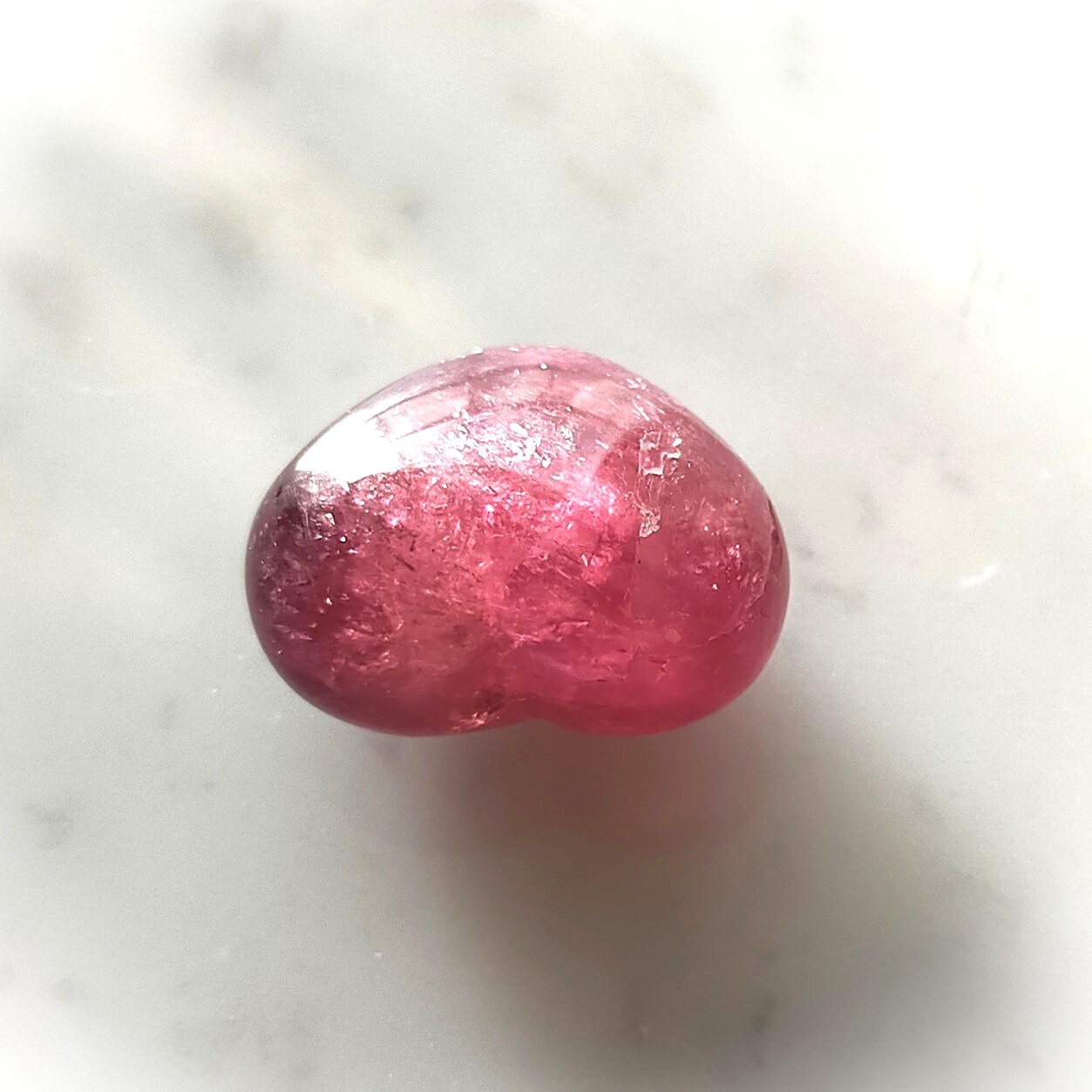 シーンの美しい高品質のルベライト(ピンクトルマリン)に、カービング技術の最高峰として有名な、イーダーオーバーシュタインカットが施された、かわいいぷっくりハートシェイプ・カービングです。