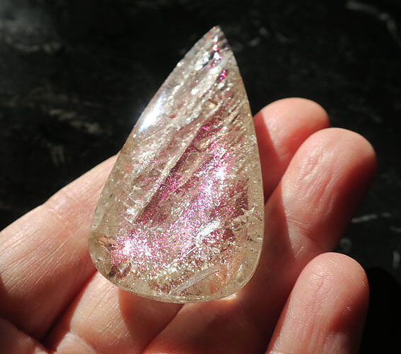 ピンクファイヤークォーツのしずく型カボションルースを入荷しました。 表面をピンクファイヤーの美しい輝きが走るコレクターズピースです。